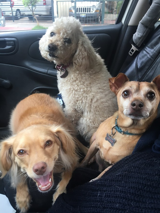 Esta fotografía capta la esencia de mis tres perritos a la perfección. Chuleta feliz, en su mente su rata gira en su rueda cantando happy-happy joy-joy. Huesos, con amor infinito preguntando ¿verdad que si me amas? Y Naif… bueno, ella solo quiere saber si ya llegamos :3